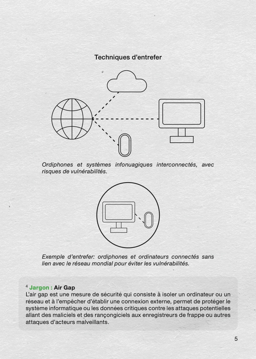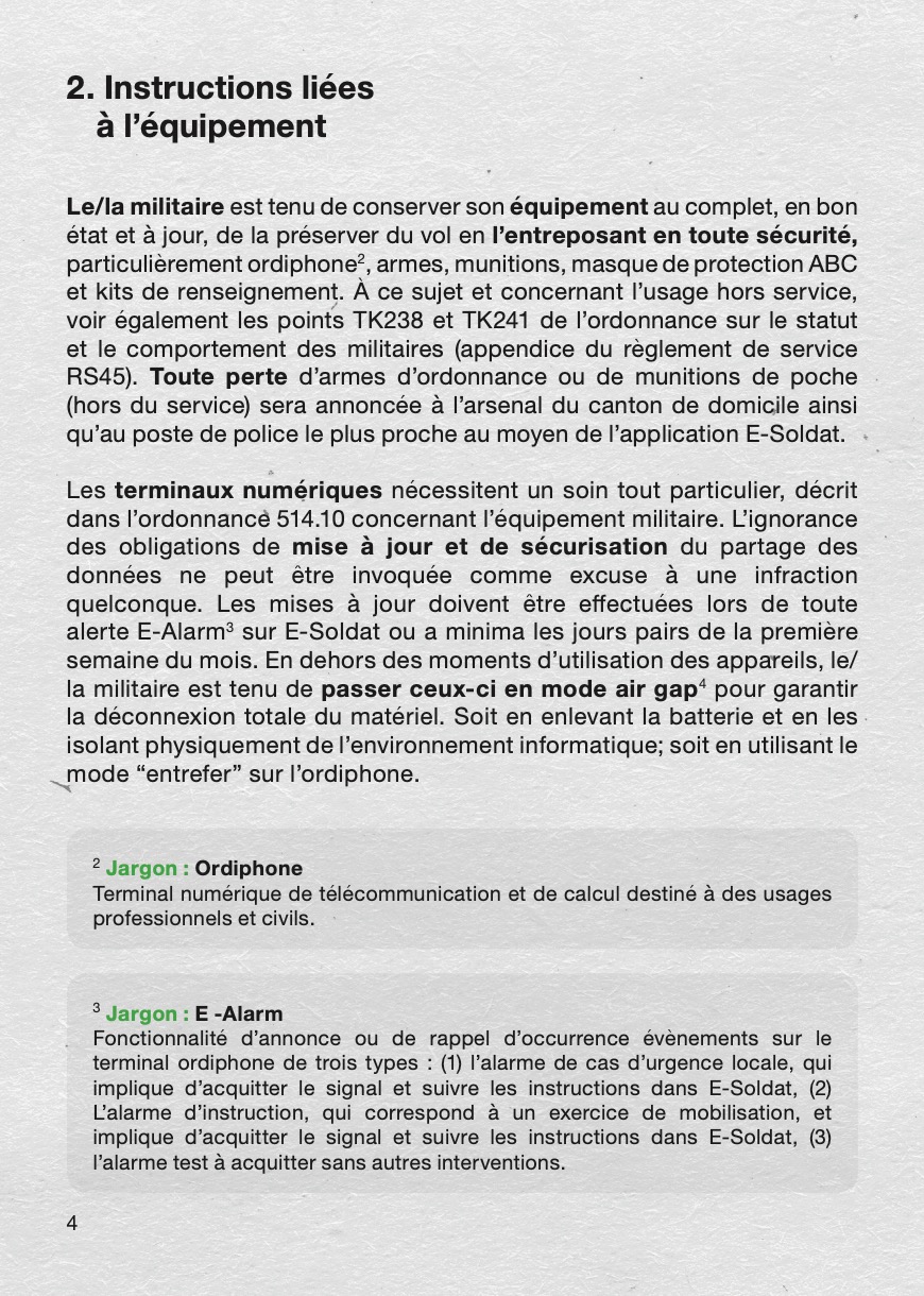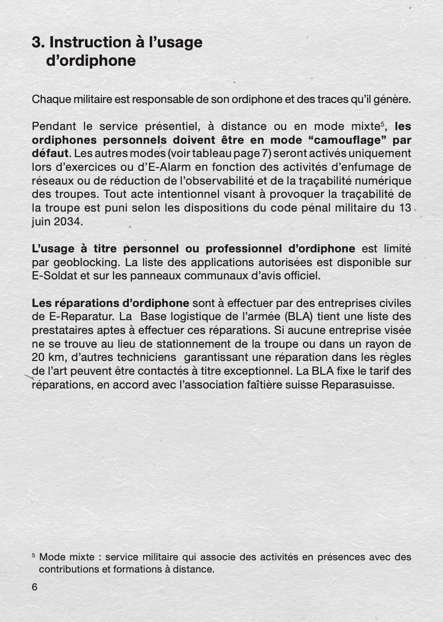 Le livret donne des instructions sur la responsabilité du soldat et les moyens d’éviter que son matériel ne soit détectable sur les réseaux utilisés. Un mode “camouflage” est également disponible par défaut sur les appareils.