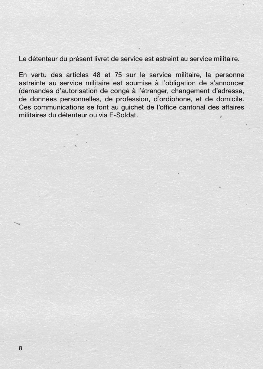 Le système militaire suisse est organisé sur le principe d’une armée de milice, ce qui fait que la plupart des soldats ne sont pas des professionnels. Chacun doit posséder un livret de service (Dienstbüchlein en allemand) qui retrace son parcours depuis le premier jour de son recrutement jusqu’aux multiples spécialisations et promotions qu’il acquiert en cours de route. Ce livret décrit également le fonctionnement des forces armées à un moment donné, avec des instructions détaillées sur les tâches militaires et le recours aux divers éléments de l’équipement militaire.