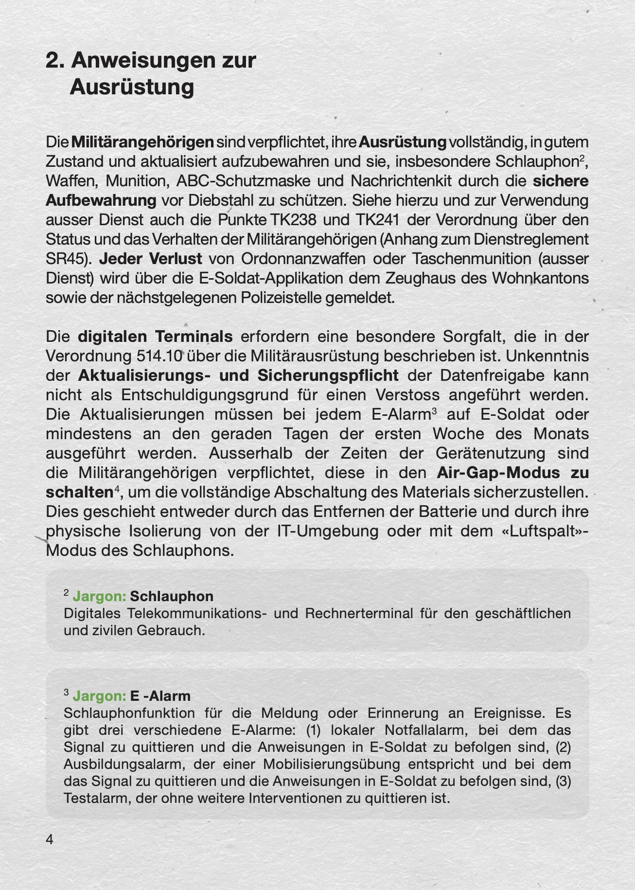 Das Heft enthält Anweisungen zur Verantwortung des Soldaten und dazu, wie er verhindern kann, dass seine Ausrüstung in den verwendeten Netzwerken entdeckt werden kann. Auch ein “Tarnmodus” ist standardmäßig auf den Geräten verfügbar.