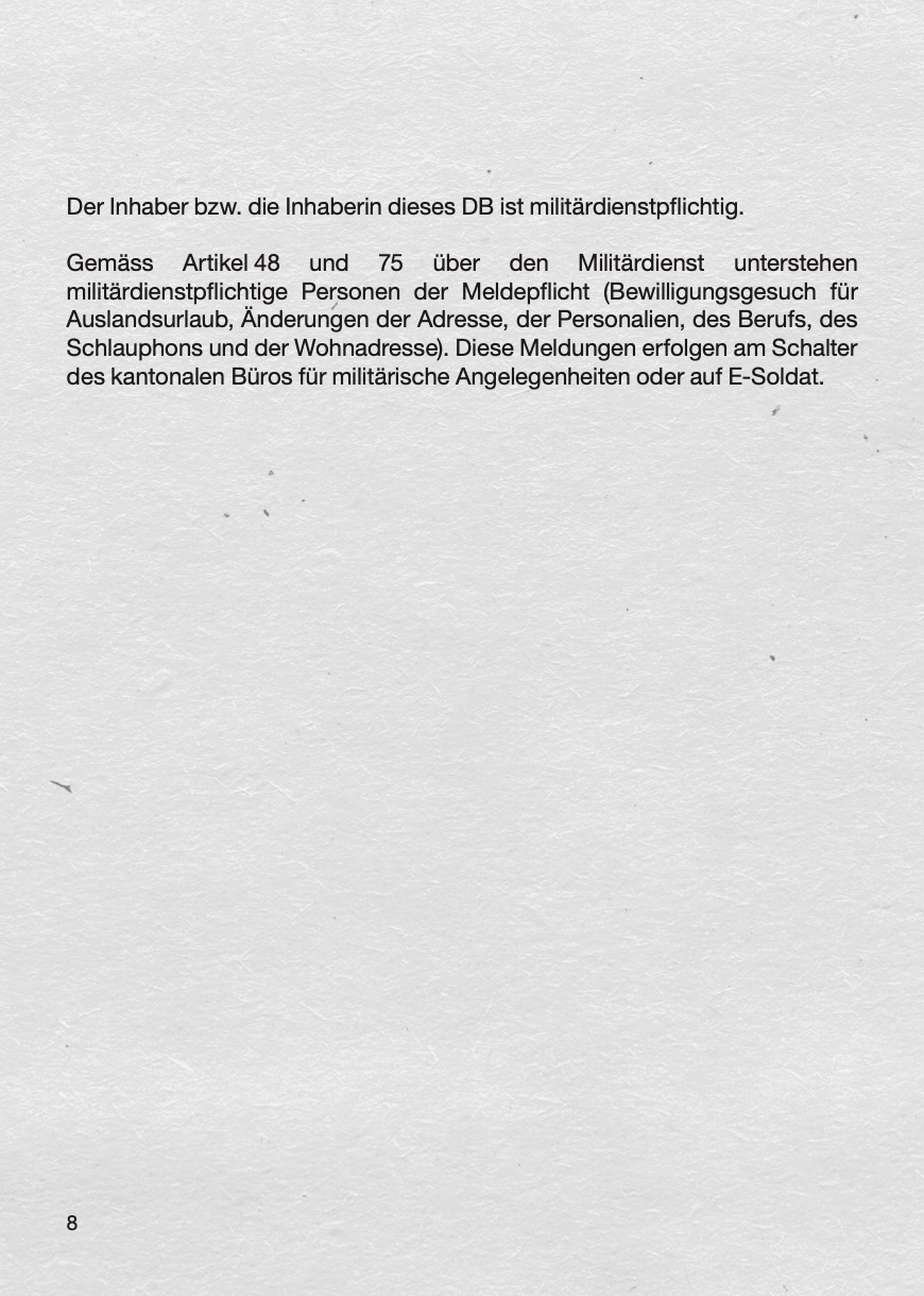 Das Dienstbüchlein ist ein gemeinsamer Gegenstand, das Teil der Schweizer Milizarmee Kultur ist. Sein zusammengesetztes und eklektisches Format in Bezug auf die behandelten Themen macht es relevant, um verschiedene zukunftsweisende Herausforderungen, mit denen die Armee konfrontiert sein wird, visuell zu verdeutlichen. Insbesondere durch die Möglichkeit, neue Praktiken konkret zu beschreiben: handschriftliche Personalisierung mit Bleistift-/Stiftbeschriftungen, Verwendung von Aufklebern und Briefmarken sowie Stauraum mit kleinem Umschlag für die Identitätskarte oder andere Dokumente.